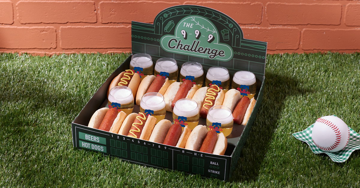 The 9-9-9 box, inspired by the viral 9-9-9 challenge, includes nine mini hot dogs and nine small beers. It is available at the South Philly Market in Section 128 for $54.99.