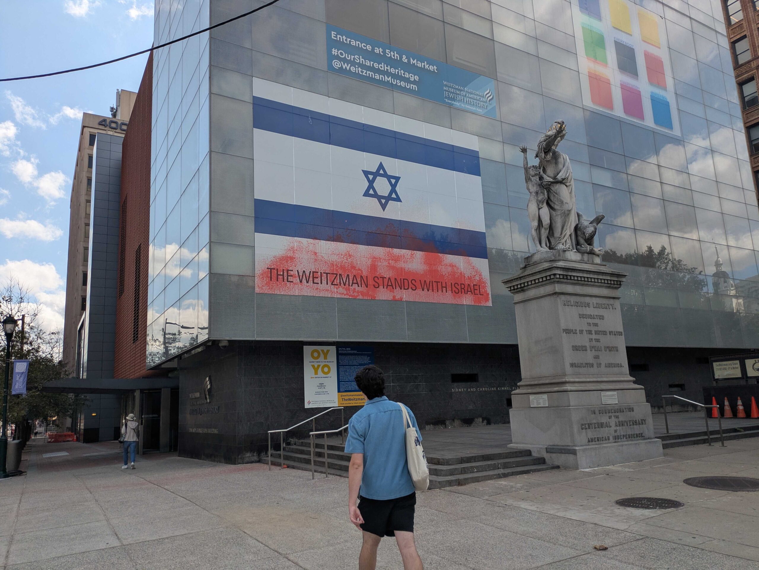 Security camera footage shows a person spray-painting a banner that depicts the Israeli flag and a message that reads "The Weitzman stands with Israel," on Aug. 18, police said. Red spray paint also was found on the building's facade and the plaza at its Independence Mall entrance. The same thing happened Aug. 25.