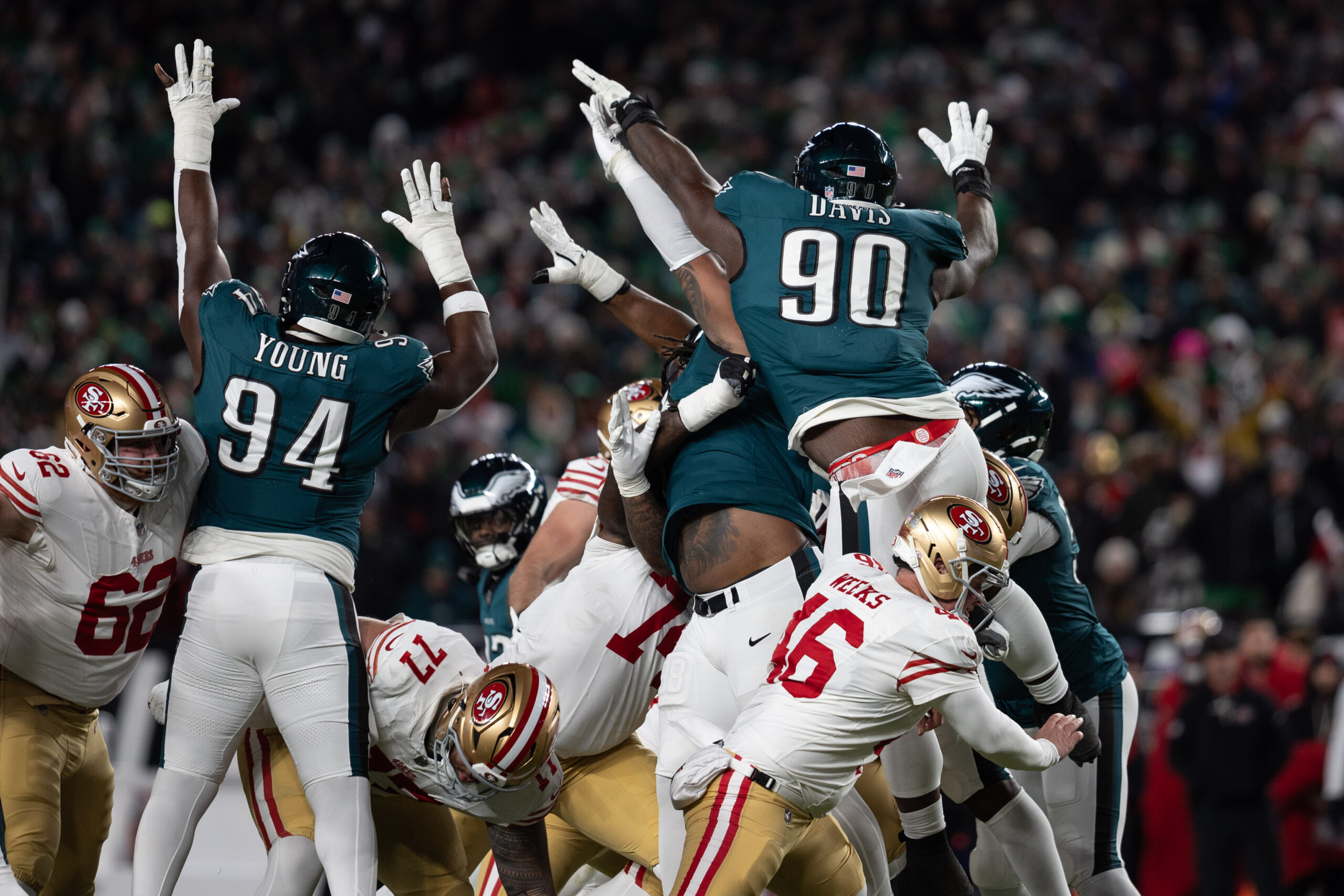 Then, after a first-down completion from Jalen Hurts to A.J. Brown on a comeback route to the right sideline, a series of quick chip runs and passes brought the Eagles in close to set up a 3rd and goal at the San Francisco 1.